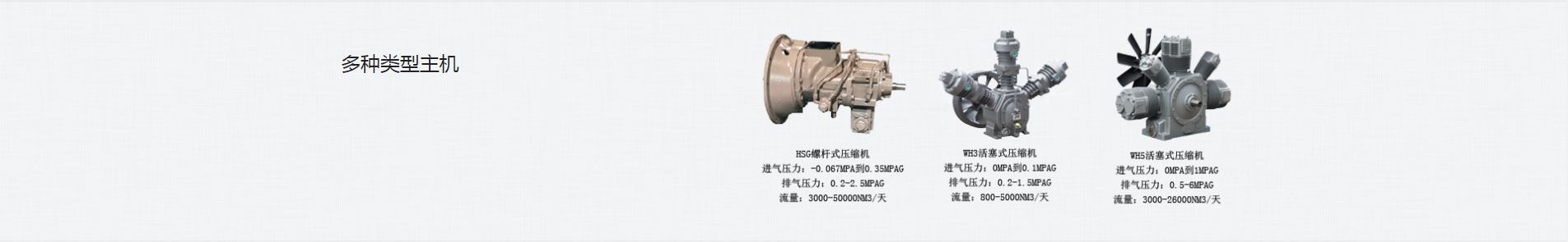 HSG螺桿式壓縮機(jī) 進(jìn)氣壓力:-0.067MPa到0.35MPaG 排氣壓力:0.2-2.5MPaG 流量:3000-50000Nm3/天 | WH3活塞式壓縮機(jī) 進(jìn)氣壓力:0MPa到0.1MPaG 排氣壓力:0.2-1.5MPaG 流量:800-5000Nm3/天 | WH5活塞式壓縮機(jī) 進(jìn)氣壓力:0MPa到1MPaG 排氣壓力:0.5-6MPaG 流量:3000-26000Nm3/天 |